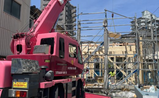 祝上棟! 予定通りの工程まで完了しました。 しかし、ピンクのレッカー...